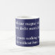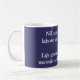 Uma caneca azul e branca com uma frase latina e a tradução em inglês por baixo. "A vida não nos dá nada aos mortais sem trabalho de duro" do poeta romano, Horace. Basicamente (no caso de não se poder adivinhar), não se consegue nada se não se trabalha duro para o conseguir.