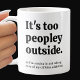 Uma caneca de café humorística dizendo: "É muita gente lá fora...vou ficar e tomar conta do meu vício de cafeína." Personalize com um nome impresso verticalmente na lateral. Faz um presente divertido ou perfeito para você.