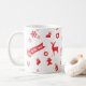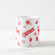 Uma caneca de Natal com repetição contínua de elementos de Natal - meias, gingerbreadman, flocos de neve, renas, Enfeites de natal, velas, árvore de Natal e as palavras "Feliz Natal" - em ilustração.