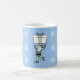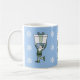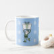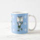Um elfo alegre carregando um grande presente num fundo azul com flocos de neve. Uma caneca de excelente para qualquer um que ama Natal e retrô, ilustrações do estilo do século médio.