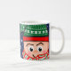 Elfo de Natal bonito vestindo um gorro muito festivo e cachecol. Marinho fundo azul com muitas estrelas. Tipografia Elfie personalizada para que você edite e torne-a sua. Ideal para decoração de Natal, um presente para um amigo ou colega de trabalho, e para chocolate quente. Feliz Natal!