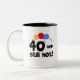 Balões das cores preliminares e texto preto que lê "40 e ainda quente!" em t-shirt do aniversário de 40 anos, em canecas, em botões, em cartões, e na outra engrenagem do aniversário!