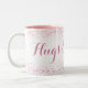 Camadas de brilho cardíaco em tons de rosa descansam acima e abaixo das palavras "Abraços e beijos." A delicada letra da escrita e os corações delicados criam uma caneca feminina para o Dia de os namorados.