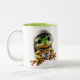 Whimsical green frog in a space helmet cups steaming coffee, blending cosmic charm with cozy cafe vibes. Bold colors and glossy helmet create playful wearable appeal.