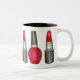 Mug apresenta uma ilustração original de tubos de batom vermelho e frascos de esmalte vermelho. Perfeito para seu viciado em maquiagem favorito!