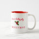 A caneca de café de Natal é mostrada aqui com um festivo Tenha uma impressão de Natal sagrada. Personalize este item ou comprar como está. Imagem do stock