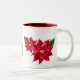 A caneca de café festiva é mostrada aqui com uma impressão de poinsettias vermelha festiva. Dentro de cor Maroon Personalize este item ou comprar como está. Imagem do stock