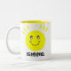 Uma caneca de café inspirada bonito com inserir amarelo e uma cara amarela com a palavra brilham embaixo. Lembrando o deixar seu brilho claro.
