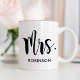 A caneca de café simples e moderna apresenta a sra. em script com texto personalizado de sobrenome. Presente perfeito para um casal recém-casado! Visite nossa loja para o Sr. Monograma Mug.