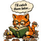 A retro-style vector illustration of a bespectacled cat deeply absorbed in reading a book, completely unaware of