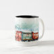 Celebrate the magical and festive holiday season with our personalized photo mug. Our vintage holiday design features a farm landscape of Christmas trees, this Christmas pattern features a farm Christmas scene with a farm, a red barn, children playing and throwing snowballs, Christmas trees and a red vintage truck