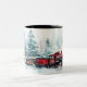 Celebrate the magical and festive holiday season with our personalized photo mug. Our vintage holiday design features a farm landscape of Christmas trees, this Christmas pattern features a farm Christmas scene with a farm, a red barn, children playing and throwing snowballs, Christmas trees and a red vintage truck