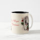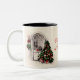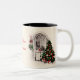 Canecas de Natal com uma cena de safena de uma árvore de Natal em frente a uma janela acesa à luz de velas à noite. Personalize o texto, mais tamanhos e cores disponíveis!