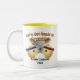 Este design de caneca reluzente apresenta um casal de personagens engraçados e ferozes de biscoitos voltados para a frente de uma tigela de mistura e cruzados de colheres de madeira sob uma imagem de texto arquivado lendo "Vamos Prepare-se para se desmoronar!" É fácil personalizar para o seu evento de assar.