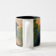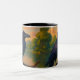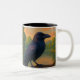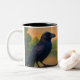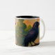 Um belo design retrata um corvo preto empoleirado em um galho de árvore estendendo-se por um lago calmo. As cores do céu limpo refletem-se na superfície da água, enquanto árvores verdes e peludas rodeiam a cena, acrescentando um toque de beleza e tranquilidade.