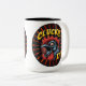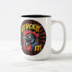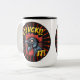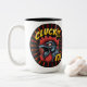 Uma cabeça grande de galo é mostrada centralmente com recursos exagerados e cores vibrantes, acompanhada de texto em negrito amarelo com a leitura "CLUCK!! IT!" num design circular. O fundo mostra linhas vermelhas radiando para fora contra um círculo escuro no fundo de uma cinza.