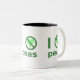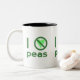 Odeio ervilhas. Design, em uma caneca de café com duas tonalidades, usa letras verdes, um coração verde e o sinal internacional "NÃO" para ler, "Odeio ervilhas". Mostra em três lados da caneca. Para aqueles que não os "coração", realmente não gostam deles, mas têm senso de humor (humor), adoram rir e ter seu osso engraçado marcado.