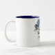Flores azuis tostadas e um quadro de ouro encerram a bela escritura Psalm 46:10 nesta caneca de dois tons; pronta para as suas manhãs silenciosas de café com Jesus.
