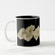Esta elegante caneca apresenta gladiolas brancas lindas e puras que se enrolam da esquerda para a direita. As pétalas recheadas destacam-se contra um fundo preto puro.