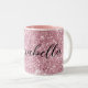 Esta caneca glamourosa e feminina personalizada apresenta um fundo brilhante, cor-de-rosa sujo e brilhante. Um nome de exemplo é impresso no centro em uma fonte de script elegante. Você pode personalizar a caneca para incluir seu próprio nome personalizado ou texto.