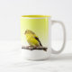 Esta caneca caracteriza um goldfinch pequeno bonito empoleirado em um ramo contra um inclinação amarelo pálido. É um pássaro maravilhoso com bico alaranjado, as asas pretas e as penas amarelas puras. Sua canção soa como o twitter original! A imagem é repetida em lados esquerdos e direitos.