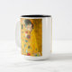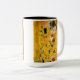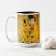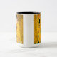 Café Mug com pintura a óleo de Gustav Klimt com folha de ouro The Kiss (1908). Um homem e uma mulher, vestindo cores ouros brilhantes, adoravelmente abraçando e beijando num campo de flores. Um presente de excelente para fãs de Arte Nouveau e de Arte Austríaca.