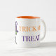 Coffee Mug mostrado em laranja e branco com um impressão de gato bruxa de Halloween. Personalize este item ou comprar como está.