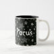 Este Halloween Mug tem um fundo estrelado e o texto Hocus de um lado e Pocus do outro.