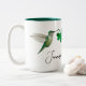 Essa caneca personalizável é um excelente presente para amantes de beija-flores, apresentando duas folhas de carregando de pássaro, pintadas manualmente, com pássaros ruinosos, de trevo. O estilo e o tamanho da fonte podem ser facilmente alterados.