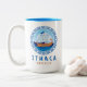Caneca de café com duas tonalidades da ilha de Ítaca, Grécia, com um desenho de um navio grego antigo e letras ao estilo grego. Este desenho de navio da Grécia Antiga tem a chave grega em um desenho circular com o mar e o céu. Este desenho de estilo grego torna esta caneca um presente ideal ou lembrança ou para beber café enquanto você está de férias na ilha de Ítaca.