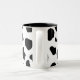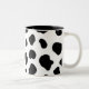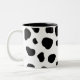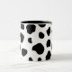 Caneca de café mostrada num impressão de vaca branco e preto giro.