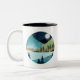 Uma bela paisagem com texturas únicas mostrando uma paisagem de lago de montanha com lua ascensão e céu estrelado em tons de azul, ouro, verde e turquesa.
