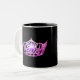 Uma impressão cor rosa quente brilhante, cor-de-rosa, enfiada na frente e no centro de cada lado desta caneca de café/cacau. Mostrada na caneca preta e branca com um interior cor-de-rosa. Personalize o seu interior e Personalize ainda mais com texto ou comprar conforme projetado.