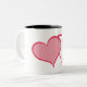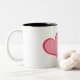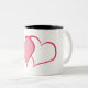 Mágula romântica com dois corações cor-de-rosa ilustrando as duas falésias de um casal lésbico. Esta caneca faz parte de um conjunto; na versão correspondente, o coração oposto é preenchido com cor rosa (ela+SHE). Presente perfeito para qualquer ocasião relacionada a parceiros. Há 6 combinações de camisas, canecas e botões disponíveis no KreaturShop.
