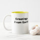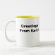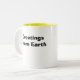 Cutes Saucer Buddies Mug com as palavras "Saudações da Terra" impressas no verso.