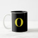 Esta caneca de café é preta sobre base branca. Um monograma está no centro para você personalizar. Aqui está um monograma de amostra de "O" em amarelo brilhante. Interior negro. Alterar cores, interior, texto etc. .