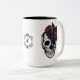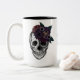 Celebrar halloween com o nosso crânio de mão na moda e escarnecido e a modesta caneca de café com ilustração floral. Linda variedade de florais pintados à mão. Pintado com cores vibrantes e vibrantes: Rúpias e cores pesadas criam um aspecto assustador. Um Crest decorativo de halloween enquadra as iniciais do monograma. Todas as ilustrações contidas neste crânio de esqueleto moderno e nos florais são obra de arte original da Moodthology. Você pode personalizar o tamanho do texto, a cor do texto, a fonte e o layout para sua preferência de design pessoal.