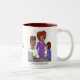 Uma caneca com um desenho engraçado sobre pais e dever de casa. Arte original de BD Cartoons.