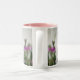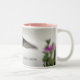 Flores e beija-flor esticam-se em torno de uma caneca de dois tons.