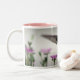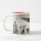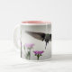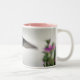 Flores e beija-flor esticam-se em torno de uma caneca de dois tons.