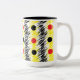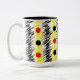 Abstrato Scribble Bolinhas Pattern Dois-Tons Coffee Mug projetado por Nisha Prabhu CuteHomeGifts. Padrão colorido de abstrato com riscas verticais pretas e bolinhas vermelha preta sobre fundo amarelo.