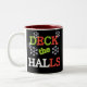 O texto vermelho, verde e branco com flocos de neve brancos diz "Deck the Halls" em T-shirts de férias, sacos de tote, canecas, ímãs e muito mais.