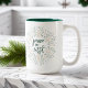 Chupa chocolate quente ou café rico da nossa caneca festiva e chica de férias apresentando "paz na Terra" em tipografia de pincel manchada rodeada por uma ilustração botânica em verde-sábio, verde-caçador e linho. Adoramos com o interior verde do caçador correspondente para outra pop de cor de férias!