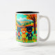 Fall Pooches Café Mug vem em cores brilhantes de outono com 4 pooches adoráveis e uma coruja amigável. As cores são canela, cinza escura, amarelo, azul e verde.