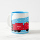 A caneca de presente de natal personalizada em vermelho e azul. O presente perfeito para o comboio a vapor ou para o neto, filho, marido ou pai carinhoso dos caminhos de ferro. O trem cartoon inclui espaço para o nome do receptor, o ano e o lugar da escolha do doador. O texto pode ser alterado clicando em personalizado. Os cartões e os sacos de presentes também estão disponíveis neste design personalizado.