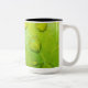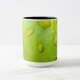 Esta Mug apresenta uma fotografia original de abstrato por ZoeSPEAK de gotas de chuva em uma folha. Na foto de close-up, vemos a textura e as veias da folha ampliadas nos contornos das gotículas de água. A folha verde amarela brilhante reflete o azul e o amarelo do céu e a luz solar.