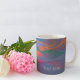 Caneca de café com padrão de lavanda minimalista moderno. Caneca de café personalizada. Adicione uma explosão de cor ao seu dia com esta caneca de café personalizada com o seu nome em listras Psicodélicas azuis verdes. O design de carta geométrica minimalista faz dele um presente único e ponderado para amigos e familiares.