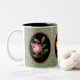 Esta Rosa Trio Mug apresenta 3 Rosas em um oval com fundo floral.