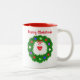 Uma caneca de férias alegre com a minha design de uma coroa decorada com corações coloridos. O texto diz "Feliz Natal!"