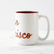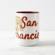 Uma bela caneca de café apresenta um dos marcos icônicos de São Francisco, o Palácio de Belas Artes, com o nome San Francisco em cores marrom e laranja, perfeito para lembrança, doação de presentes e muito mais.
